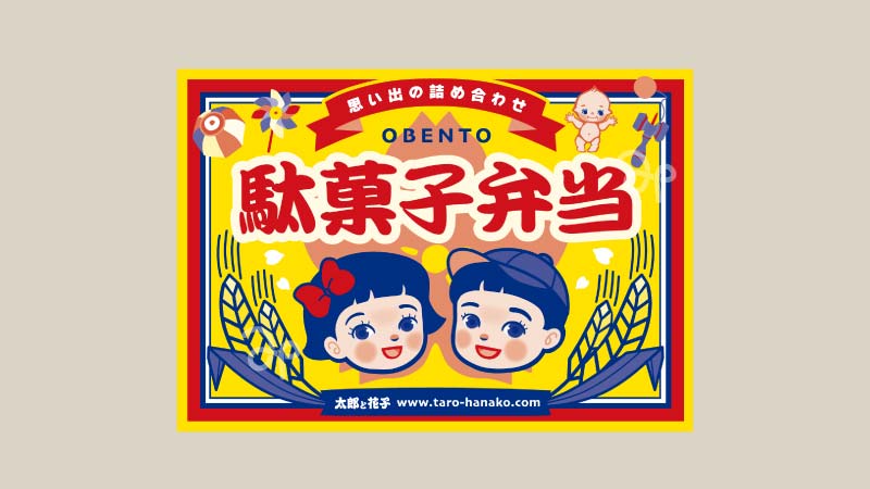 テイクアウト用のお弁当容器にシールを貼ってお菓子のアソートを販売しています。