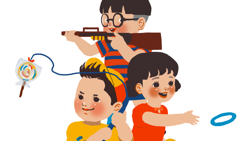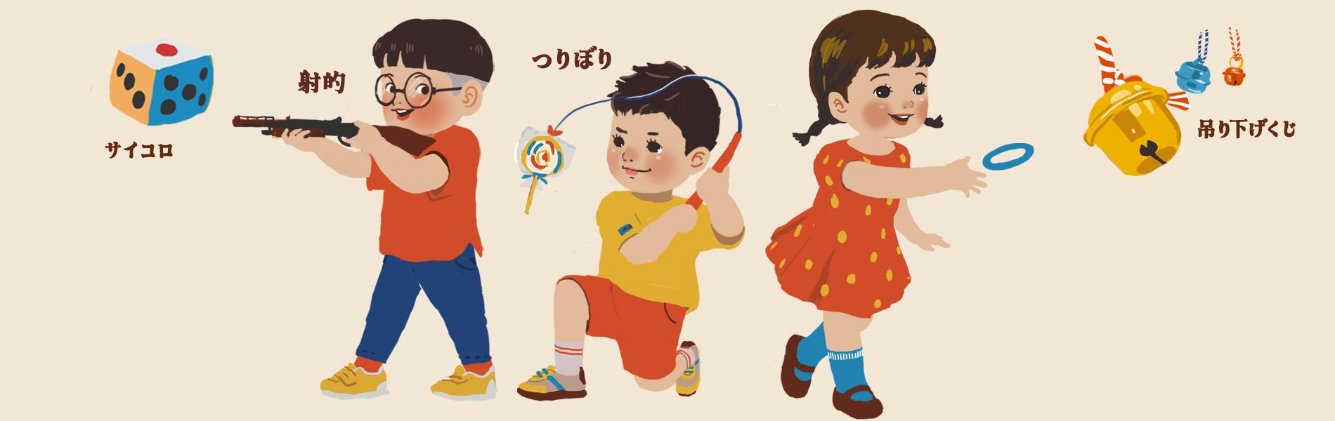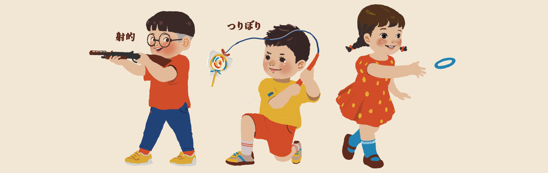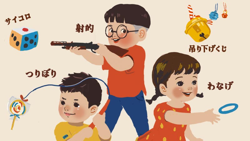つりぼり、わなげ、射的。遊ぶ子供のイラストレーションです。
