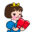 2頭身のおとぼけキャラクターです。素敵なシールがあるんだよと説明しているのかな。